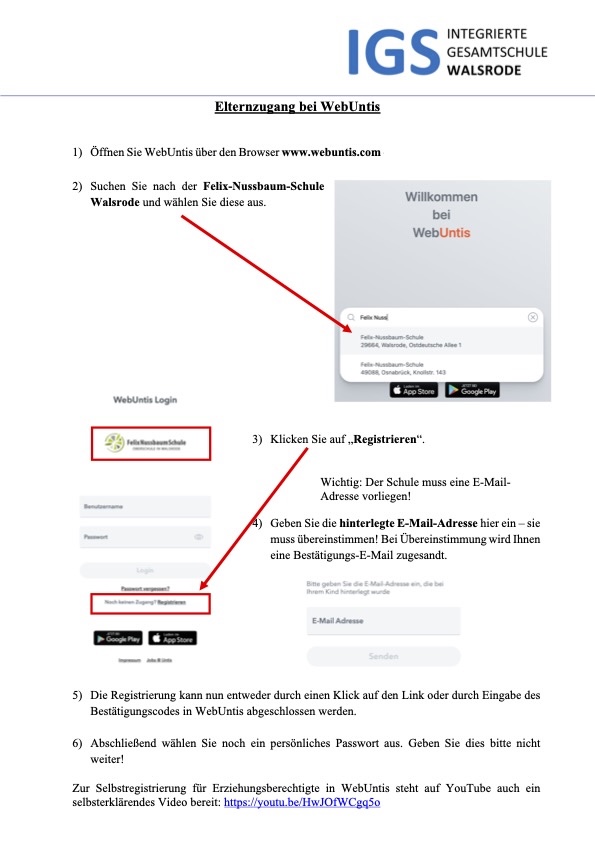 Sie können sich selbstständig bei WebUntis registrieren, um den Stundenplan, aktuelle Änderungen und weitere Informationen zur Schule bequem online oder über die App einzusehen.
